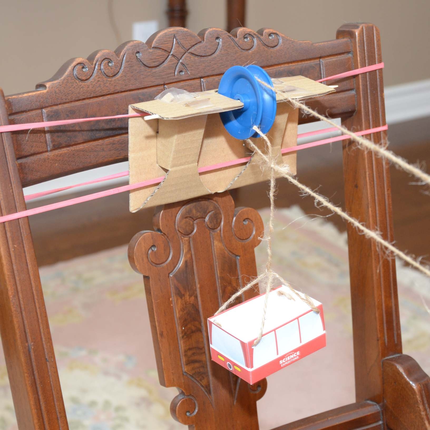 My scientist really wanted to work on the rest of the box himself, just to see if he could do it. Of course, the next project he picked was a ball launcher. In this project, you attach an elastic band into a small cardboard tube with a piece of dowel as a lock when you pull the elastic back. (Elastic Potential Energy, anyone?) Then you put a lightweight ping-pong ball inside, gently squeeze the bottom of the tube, and ….. POW! the dowel comes loose, the elastic snaps, and the ball goes flying across the room. My son was able to assemble this project without help, but did find the task of pulling the elastic back and “locking” the dowel in place a little frustrating. Probably because he was trying to push it down from the top instead of pulling it out the bottom. We actually tried a few different small balls that we had around the house – testing to see what results we had. We tried different launch techniques too, releasing the dowel manually instead of squeezing for example. It created a great opportunity to talk about making a hypothesis while experimenting.
