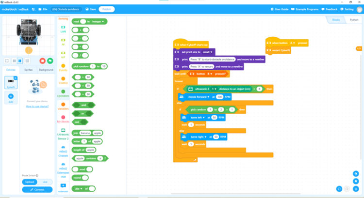 Once you’ve created, edited, or copied the code that you want, you attach mBot2 to your computer or device and click the connect button. Once connected, you have the option of either uploading the code directly onto your Cyber Pi – creating a new program which you can run after disconnecting it from the computer, or you can do a “live” option, where the robot will do the tasks you’ve coded while still connected to the computer.